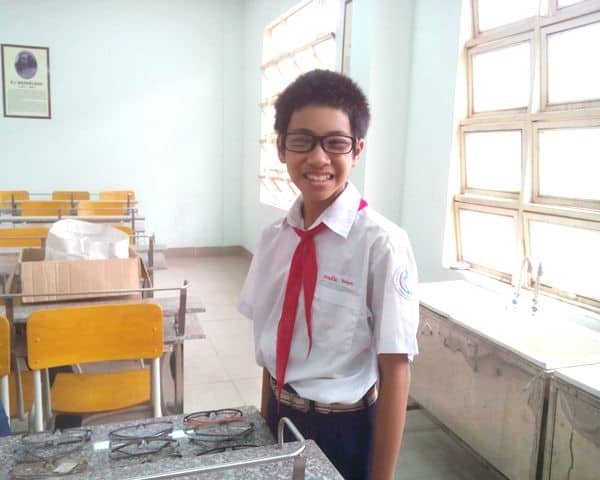 De 13 jarige Thinh woont samen met zijn ouders in Binh Duong, Vietnam. Sinds een aantal jaren zag hij niet goed meer in de verte. Op school kon hij niet meer zien wat de docent op het bord schreef. “Vaak kon ik de opdracht niet lezen en dan kon ik daardoor niet mee doen met de les” vertelt Thinh. Tijdens een schoolscreening op zijn school werd het duidelijk dat Thinh een bril nodig had. Zijn ouders waren helaas niet in staat om een bril voor hem te kopen.