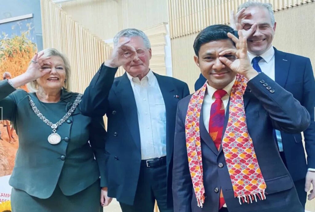 Foto-onderschrift v.l.n.r.: Burgemeester van Bloemendaal Ankie Broekers-Knol, Ambassadeur van Nepal in België Gahendra Rajbhandari, oogarts en oprichter Gerard Smith en directeur Eye Care Foundation Björn Stenvers tijdensde viering van het 40-jarige bestaan van Eye Care Foundation (Fotograaf Lia Marmelstein).